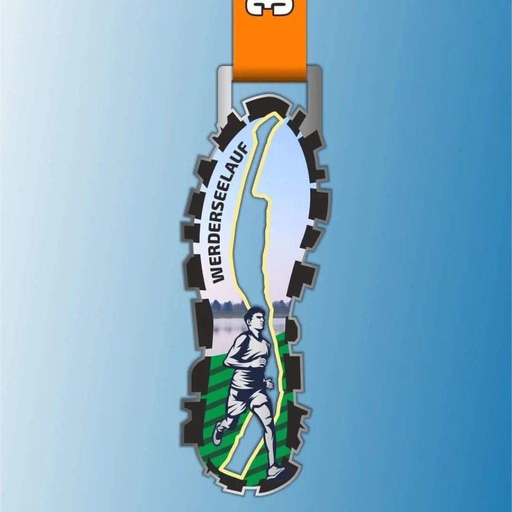 Hier ist Eure Medaille für den 3. Werderseelauf 2023! 11 cm hoch, 4 cm tief und 3 mm breit – mit anderen Worten: MASSIV! Wie findet Ihr sie?